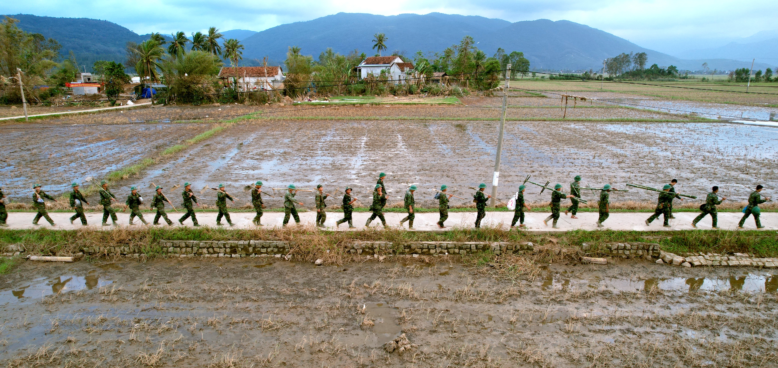 Có lẽ từ rất lâu quân đội mới triển khai một cuộc điều động thần tốc với quân số lớn như vậy. Và hành trang người lính không phải súng đạn, mà là cuốc xẻng, cùng trái tim ấm nóng của Bộ đội Cụ Hồ hướng về bà con vùng thiên tai.
