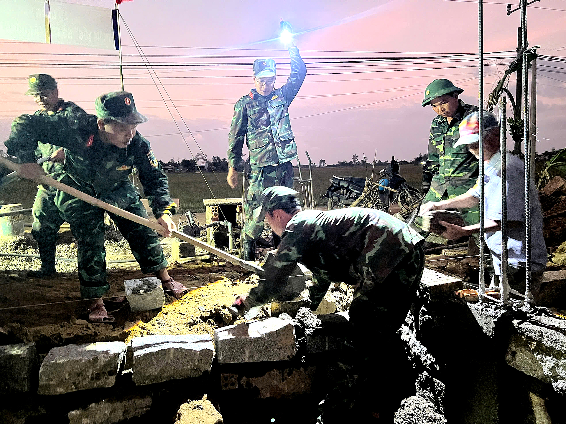 Bộ đội Lữ đoàn vận tải 655 chong đèn thâu đêm làm nhà cho gia đình bà Trần Thị Duyệt, thôn Phú Hữu, xã Hòa Thịnh, tỉnh Đắk Lắk - Ảnh: B.D.