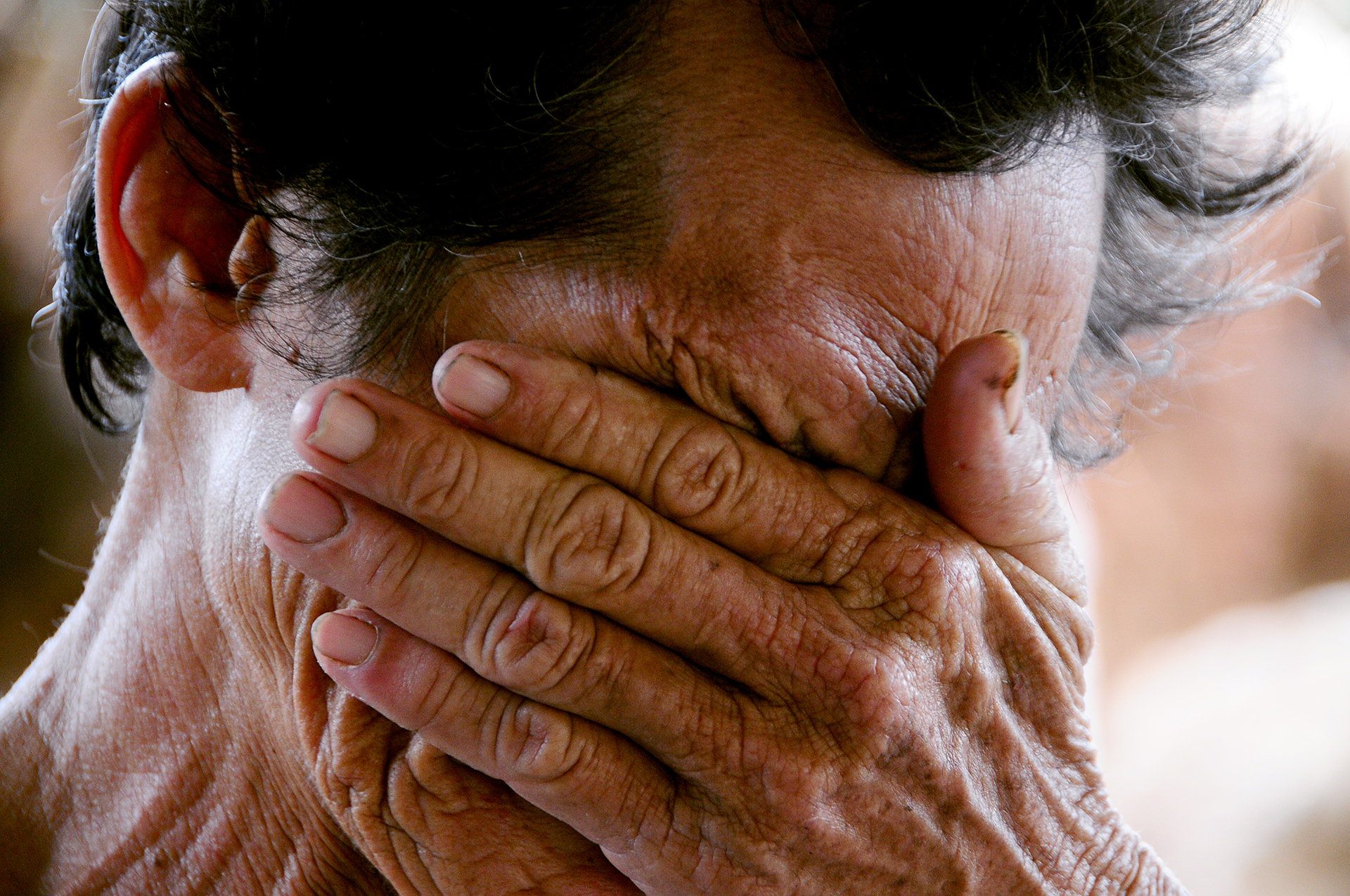 Ông Trần Văn Cam, thôn Văn Đức, xã Tuy An Đông (Đắk Lắk) khóc trong nỗi tuyệt vọng, đau khổ khi nhà bị lũ vào đánh sập - Ảnh: B.D.
