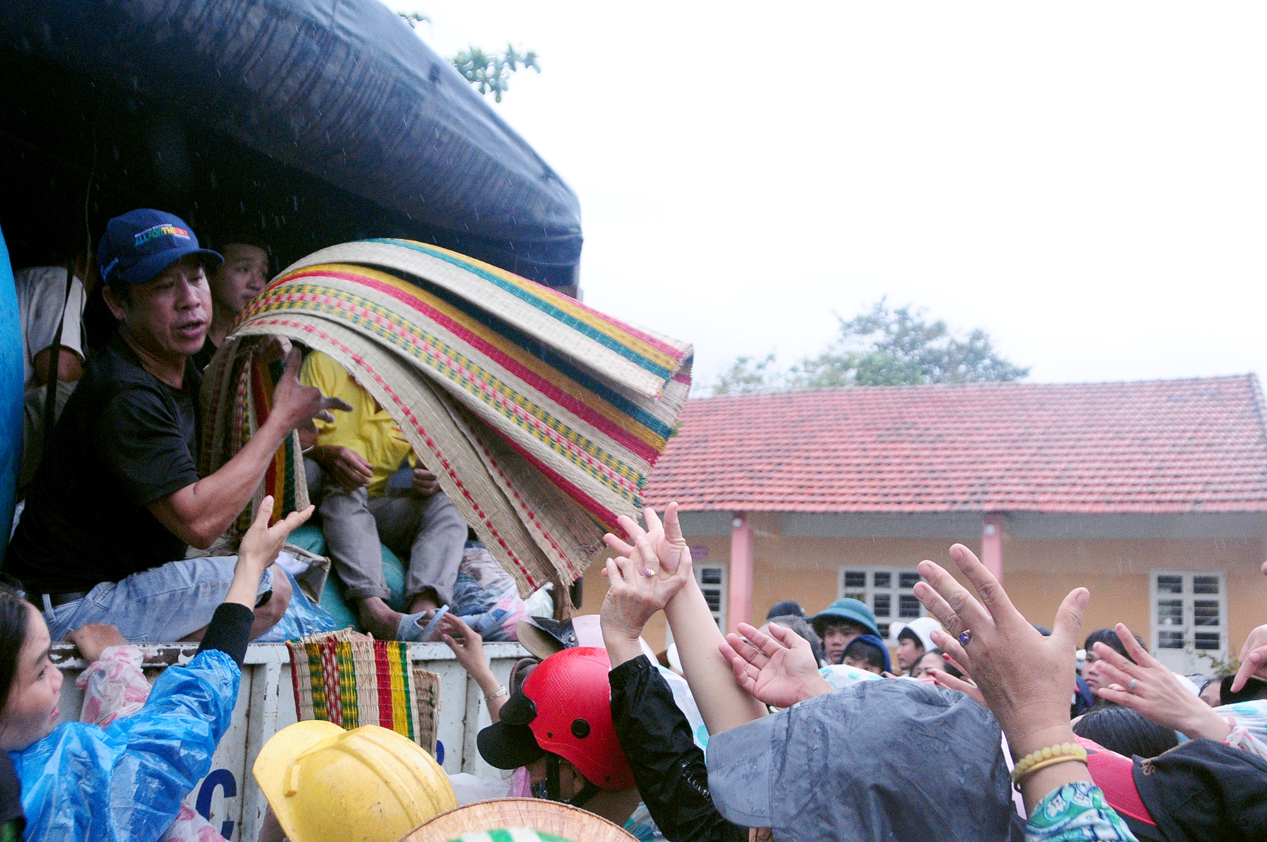 Người dân xã Tuy An Đông (Đắk Lắk) vây lấy xe cứu trợ để xin một suất quần áo, chăn chiếu sau khi lũ quét qua - Ảnh: B.D.