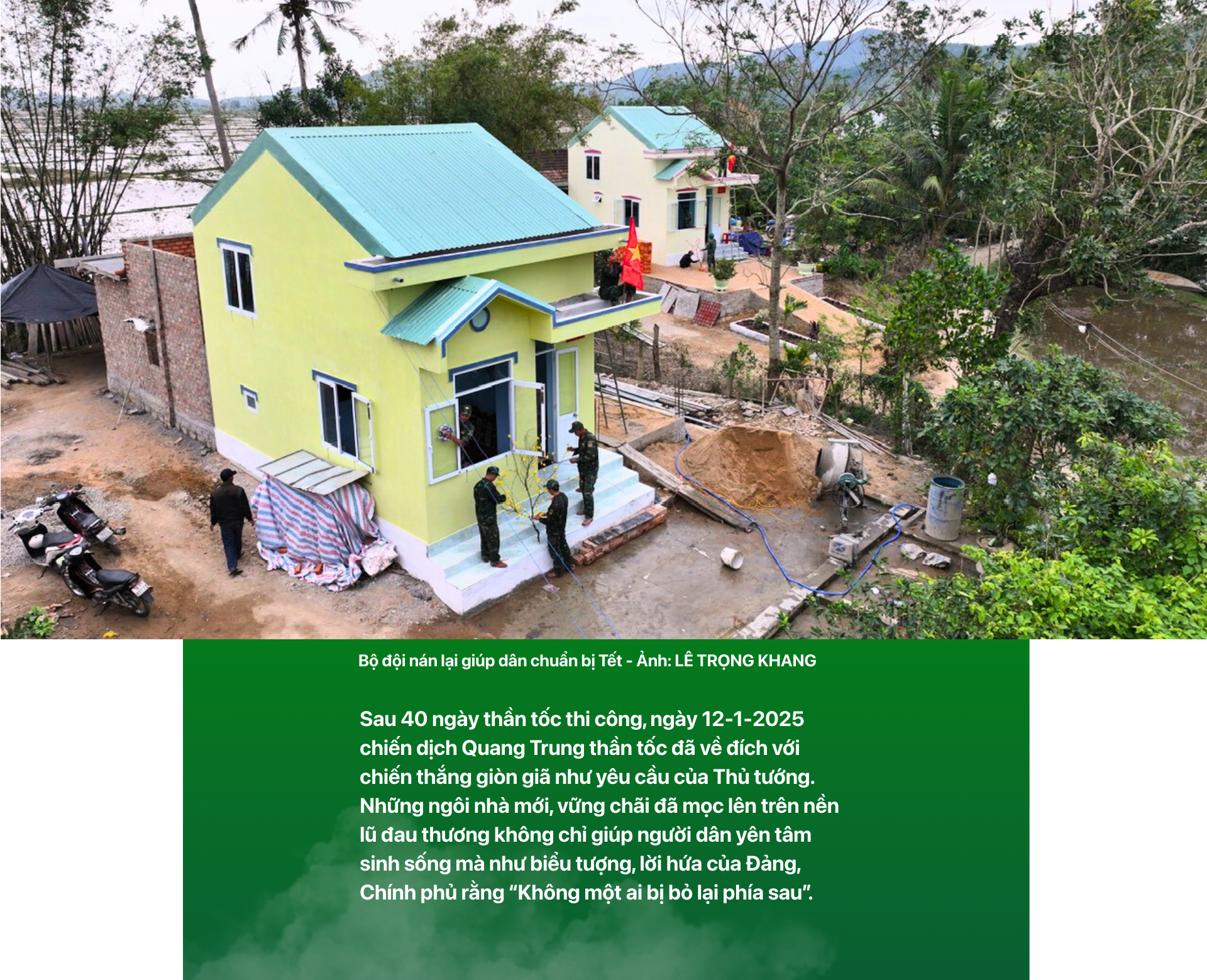 Thực hiện yêu cầu của Thủ tướng, một cuộc hành quân thần tốc, quy mô trên cả nước hướng về vùng lũ miền Trung của các lực lượng quân đội, công an, các địa phương. Từ chỗ canh cánh nỗi lo sạt lở, bão lũ trong những ngôi nhà sơ sài được làm hàng chục năm trước tại các làng quê nghèo, Chiến dịch Quang Trung không chỉ "vá lành lặn" lại những mảng rách ở xóm làng sau lũ mà tạo ra cơ hội an cư lâu dài và một bước đổi đời cho nhiều hộ dân vùng lũ.