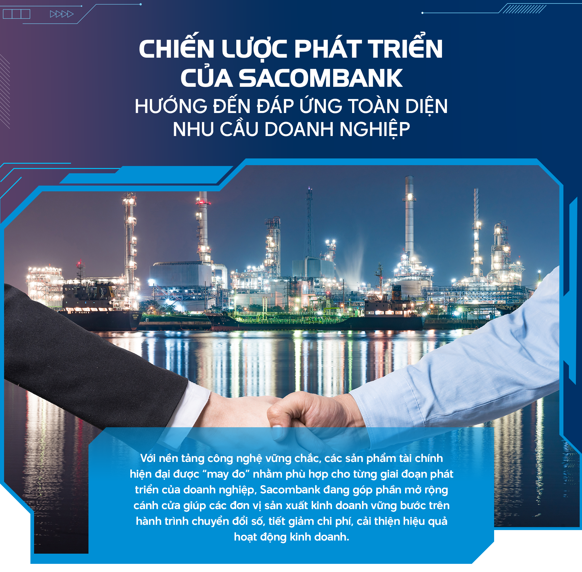 Với chiến lược "lấy khách hàng làm trọng tâm", Sacombank luôn thấu hiểu doanh nghiệp cần gì ở mỗi giai đoạn. Đồng thời, trong vai trò một nhà cung cấp giải pháp, ngân hàng không ngừng mang đến các sản phẩm, dịch vụ chất lượng, giúp doanh nghiệp tiết giảm chi phí và tối ưu hiệu quả hoạt động.