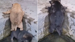 Chó bất lực khi phải đứng căng dây cho cậu chủ nhảy