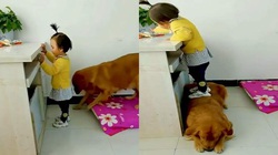 Không có đủ bạn chơi, cậu chủ nhỏ đành phải nhờ chú chó thế vị trí và thỉnh thoảng lại cưng nựng con vật để động viên tinh thần.