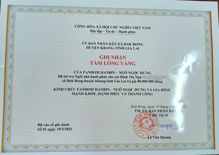 Bên cạnh tặng nhà Hạnh Phúc, fandom Hanbin còn dành tặng em một suất học bổng tới năm 18 tuổi để em tiến gần hơn tới ước mơ của mình.