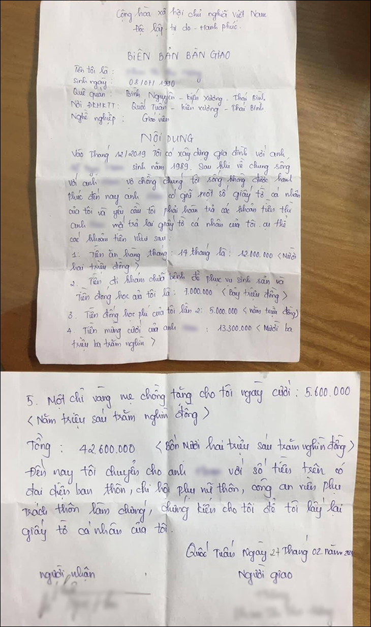 Tờ "biên bản bàn giao" này được lập ra với sự chứng kiến của bên thứ ba nhằm xác nhận vợ cũ đã đưa anh chồng đầy đủ số tiền, để lấy lại những giấy tờ tùy thân mà người chồng đang giữ.