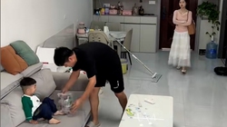 Nghe tiếng bước chân vợ về, người chồng đang nằm lướt điện thoại vội vàng bật dậy bế con nhỏ rồi than thở ở nhà trông con mệt.