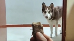 Bị rùa cướp mất cục xương ngay trước mặt, chú chó rất bực bội nhưng không làm được gì.