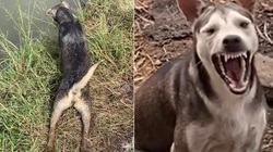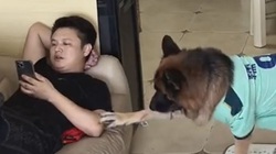 Chú chó ngoan ngoãn ngậm một đầu dây để hai cô chủ nhỏ chơi nhảy dây.