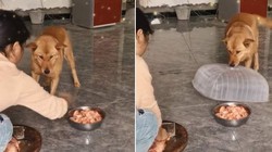 Thấy chủ ra ngoài nghe điện thoại, chú chó liền lấy lồng bàn đậy tảng thịt để không bị ruồi bu.