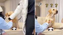 Thấy ông chủ về, chú chó liền mách lẻo đồng bọn ở nhà nghịch ngợm, phá hư đồ.