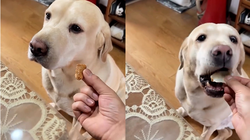 Chú chó muốn đi chơi nhưng luyến tiếc tô thức ăn