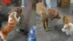 Vài giây trước khi cành cây khô rơi xuống đường, người chủ đã được chú chó đẩy ra xa và tránh được tai nạn trên trời rơi xuống.