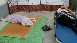 Sau khi thơm lên trán, chú cún nhẹ nhàng kéo chăn đắp cho cậu chủ để ngủ không bị lạnh.