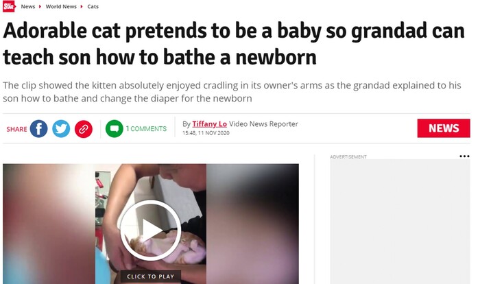 Trước đó, tài khoản Facebook Vinh Quang Phạm đã chia sẻ cảnh hướng dẫn tắm trẻ sơ sinh một cách chi tiết, dễ hiểu của một người đàn ông trung niên. Điểm đáng chú ý nhất chính là nhân vật đóng vai trẻ sơ sinh trong đoạn clip là một chú mèo đáng yêu, ngoan ngoãn.
