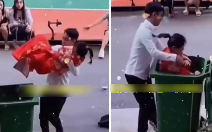Chú rể không kiềm được mình bỗng hóa... "siêu anh hùng", ném thẳng cô dâu vào chiếc thùng rác gần đó trước ánh nhìn ngỡ ngàng của nhiều người xung quanh. Mọi người nhanh chóng chạy lại để "giải cứu" cô dâu, đưa ra ngoài. Vẫn trong bộ lễ phục đỏ chót, cô dâu vội chạy đuổi theo chú rể, quyết "một vừa hai phải" tiếp tục với anh.