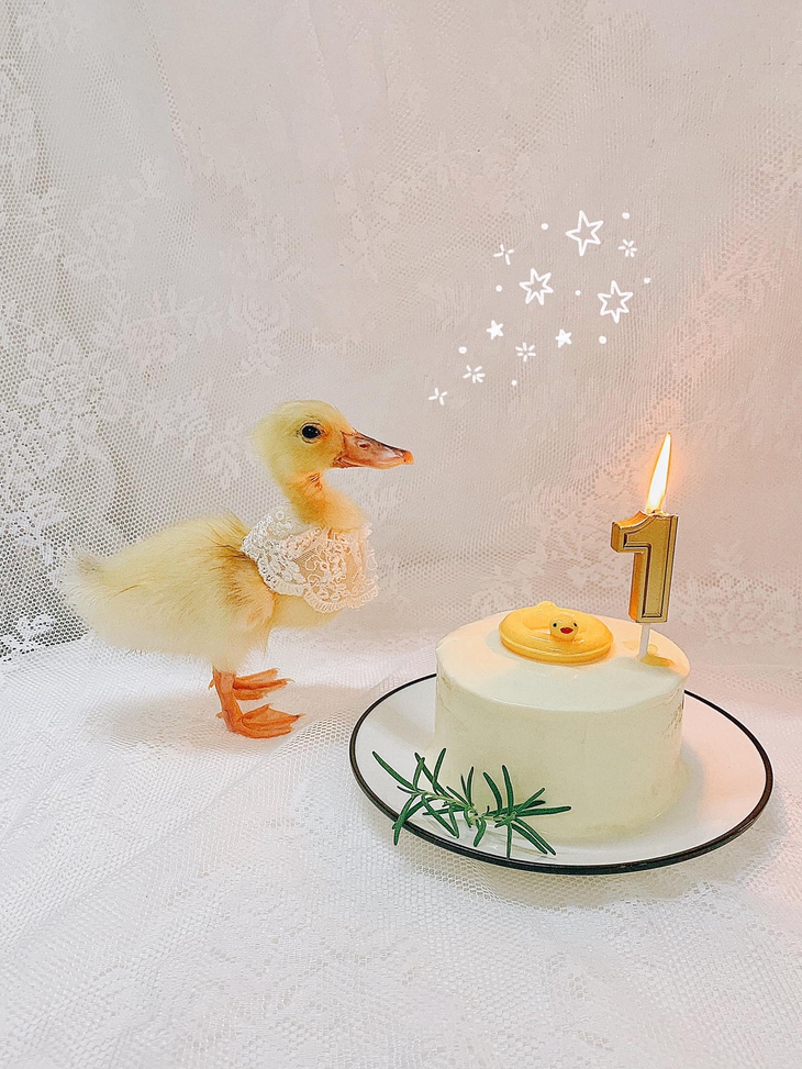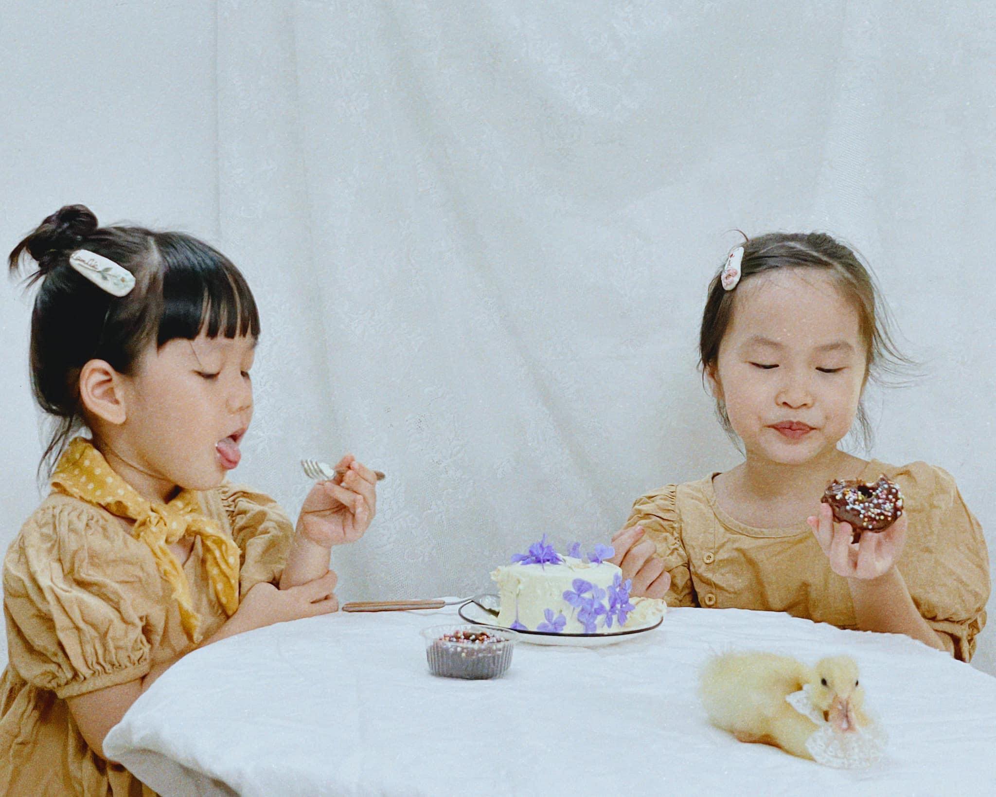 Kiu đón kỷ niệm 1 tháng bên bé Tĩn và một bạn hàng xóm. (Ảnh: NVCC)Chị Hồng Nghĩa kể: "Chiếc bánh là món quà mà Kiu được tặng một cách rất bất ngờ. Mình có mua thêm nến, vặt ít lá hương thảo ngoài vườn và đặt một chiếc phao vịt lên mặt trên để trang trí. Suốt buổi liên hoan, Kiu ngồi ngoan và không phiền hà gì, trong khi mọi người loay hoay chụp ảnh cho bạn cả nửa tiếng. Thậm, chí còn rất biết 'tạo dáng' nữa, nên 10 điểm cho Kiu về sự hợp tác này".