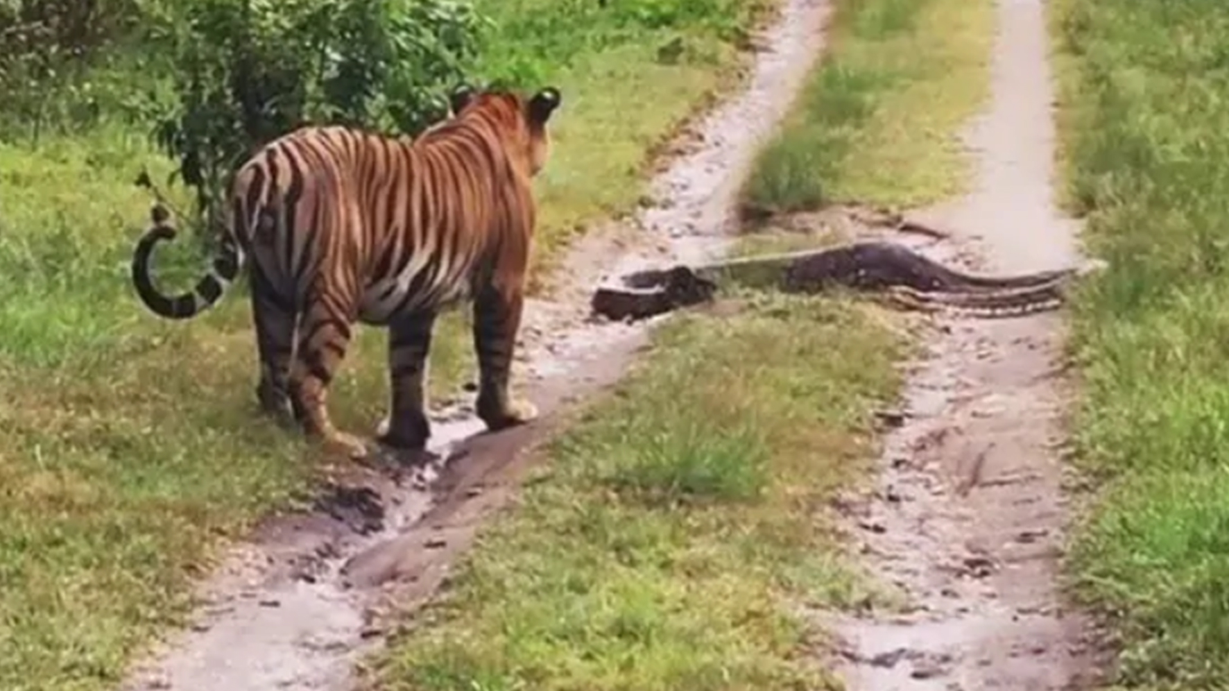 Chúa sơn lâm sợ khiếp vía khi gặp con trăn khủng