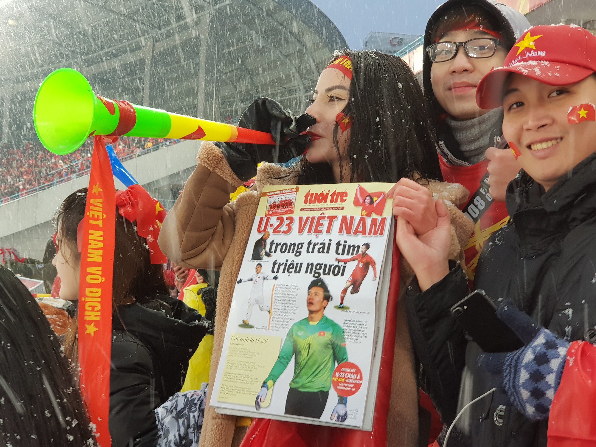 CĐV Việt Nam đi trong mưa tuyết để đến SVĐ Thường Châu cổ vũ cho đội tuyển U-23 VN đá trận chung kết Giải U-23 Châu Á ngày 27-1. - Ảnh: TRUNG NGHĨA