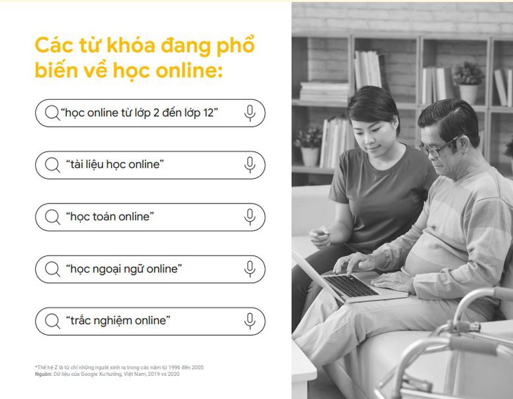 Theo báo cáo này, giáo dục nay đã chuyển lên mạng là chính bởi thế hệ Z (là thế hệ sinh ra từ năm 1996 đến năm 2005) nay chủ yếu sử dụng Internet để “tối đa hóa việc học, chia sẻ nguồn lực, tìm câu trả lời và tìm sự trợ giảng bổ sung”. Những tìm kiếm liên quan đến “học trực tuyến” đã tăng đến 150% so với cùng kỳ 2019.