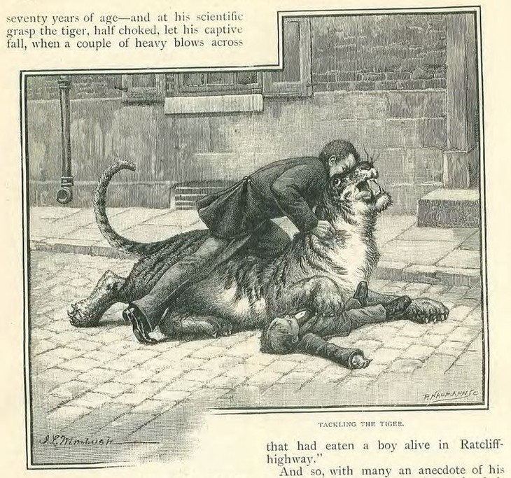 Jamrach lập tức đuổi theo tóm cổ con mãnh thú, phóng lên lưng và vật lộn với nó một lúc, cho tới khi kêu cứu được một người qua đường mang xà beng chạy tới và nện 3 phát vào mắt con vật. Lúc này, con mãnh thú mới chịu thả cậu bé ra nhưng vẫn chưa hoàn toàn bất tỉnh và tiếp tục vùng dậy. Trong khoảnh khắc đó, Jamrach tự mình cầm lấy chiếc xà beng và cho con thú thêm một cú trời giáng nữa vào đầu bằng hết sức bình sinh của ông. Con hổ hoảng sợ và tự động quay lại vào cũi.