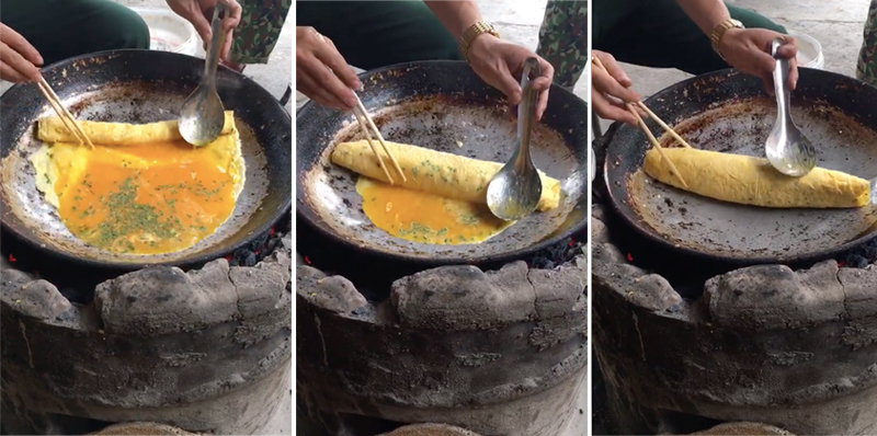Theo đó, dễ dàng nhận thấy người "cầm trịch" màn trình diễn này là một "anh nuôi" trong quân đội. Chỉ với chiếc bếp than, chảo to, một đôi đũa và cái muỗng, anh chàng đã thoăn thoắt tạo nên một cuộn trứng "siêu to khổng lồ".