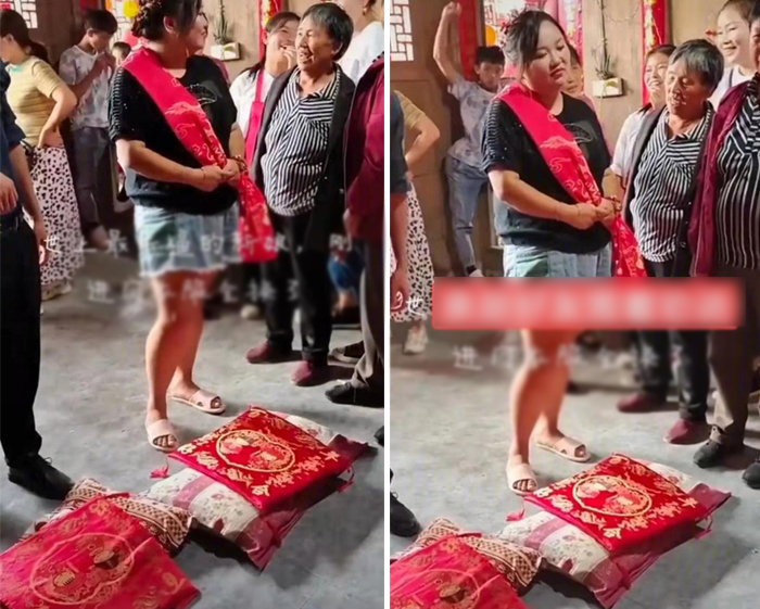 Cô dâu thể hiện thái độ chống đối dù được mọi người khuyên can, thúc giục thay đổi lễ phục.Theo lời kể của người thân và bạn bè đàng trai, cô dâu thể hiện thái độ chống đối như vậy là do không được mua váy cưới. Chưa kể, khi bước vào gia đình nhà trai, cô ngỡ ngàng trước gia cảnh nhà chồng, vốn không quá khá giả, có phần khá bình dị.