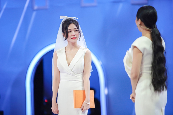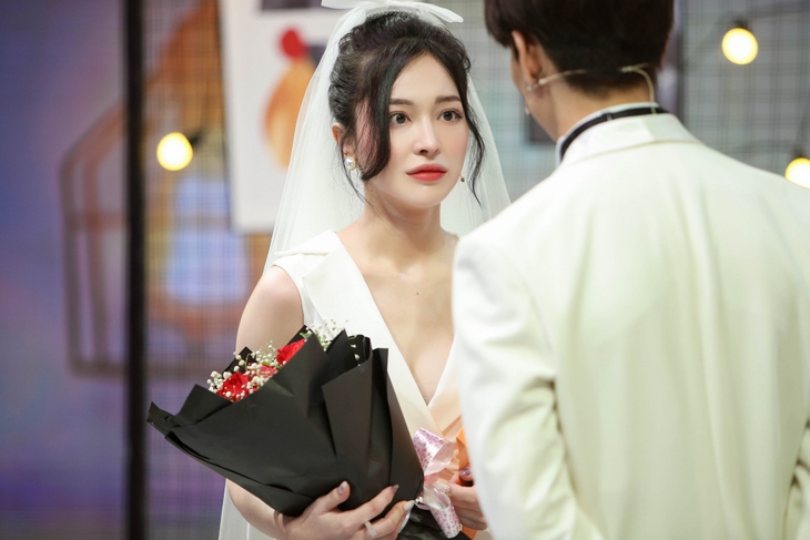 Cả hai cùng mặc lễ phục cưới bước trên sân khấu Tỏ tình hoàn mỹ trong sự chứng kiến của khán giả và dàn nghệ sĩ bình luận.