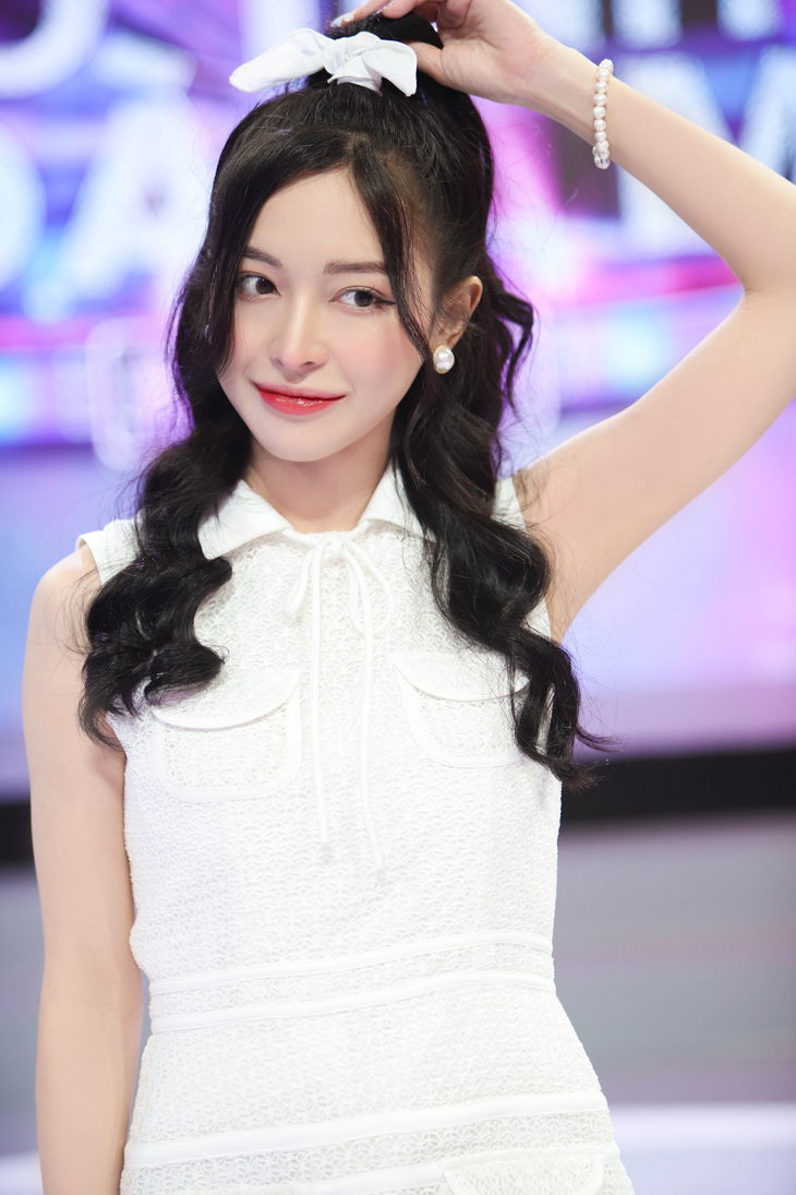 Xuất hiện trên sân khấu, Linh Phi mặc váy trắng thanh lịch, mái tóc dài uốn xoăn nhẹ cùng làn da trăng sứ càng khiến vẻ xinh đẹp của cô trở nên quyến rũ.