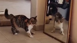 Cô gái đang nằm lướt điện thoại trên giường có màn phản xạ xuất thần khi kịp thời đưa chân đỡ chiếc gương bị con mèo làm đổ.