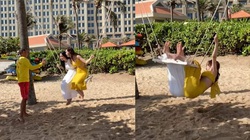 Cô gái uống nước no khi ngồi tạo dáng trước sóng biển