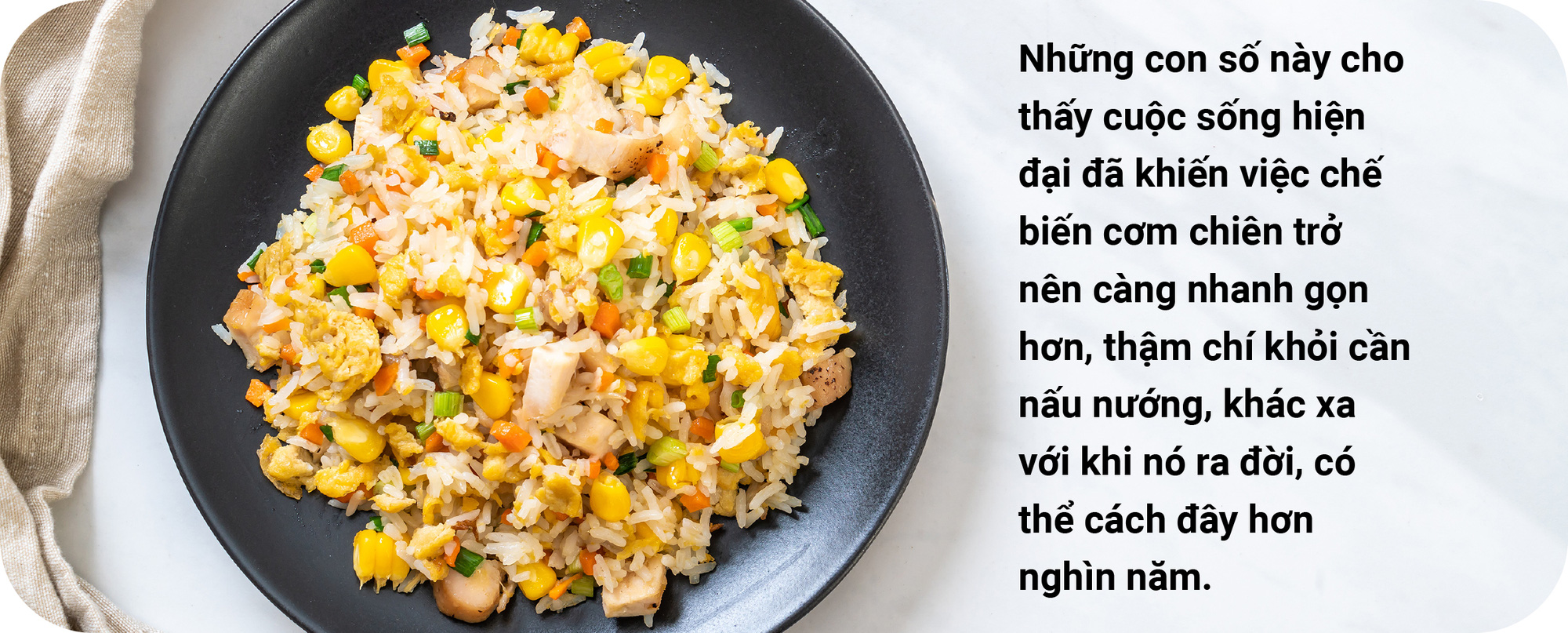 Đành rằng cơm chiên dễ nấu và không tốn hàng tiếng đồng hồ như nhiều món khác, nhưng đối với thời đại ngày nay, ít phút loay hoay trong bếp vẫn là một cực hình với những cái bụng đói bất chợt không muốn làm gì, đừng nói là vào bếp, đi ăn tiệm, hay đặt đồ ăn về nhà.