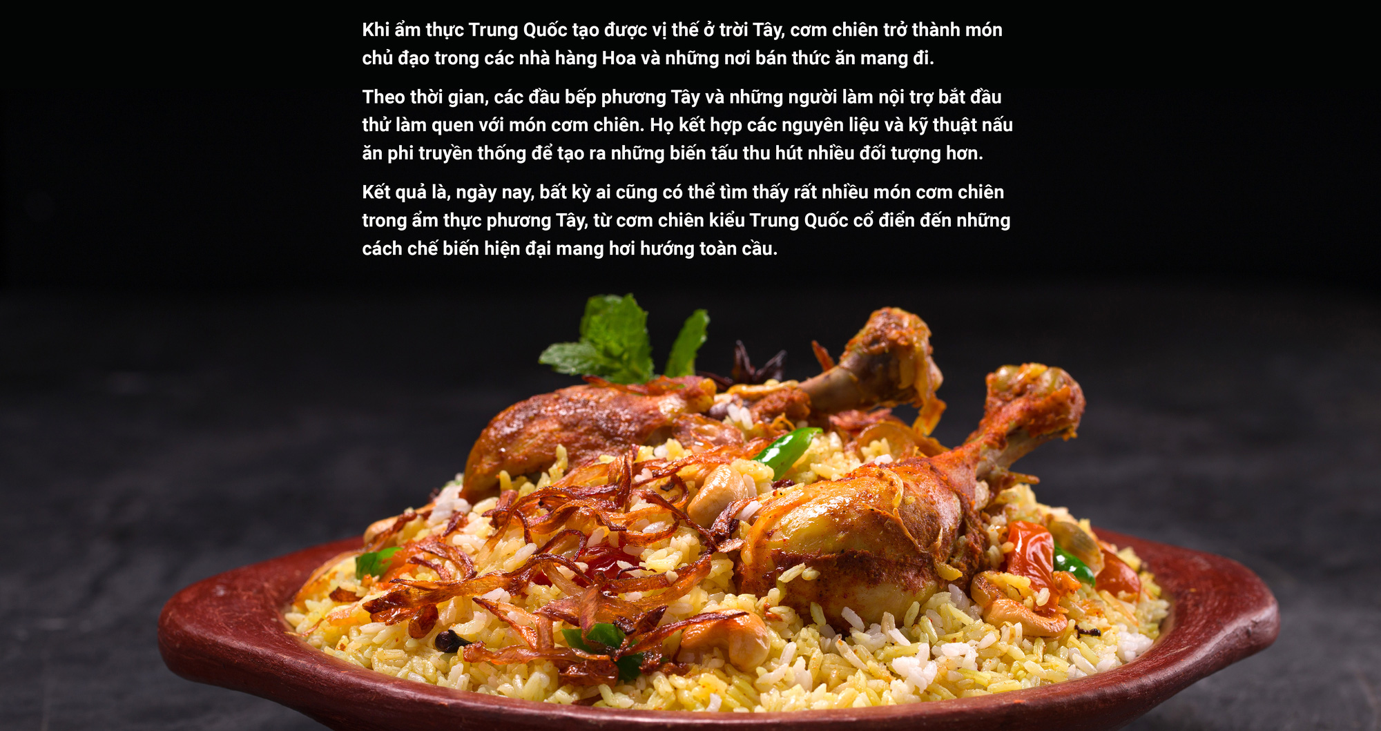 Theo trang recipes.net , làn sóng di cư mang ẩm thực truyền thống của Trung Quốc, bao gồm cả cơm chiên, đến mọi ngóc ngách trên thế giới.