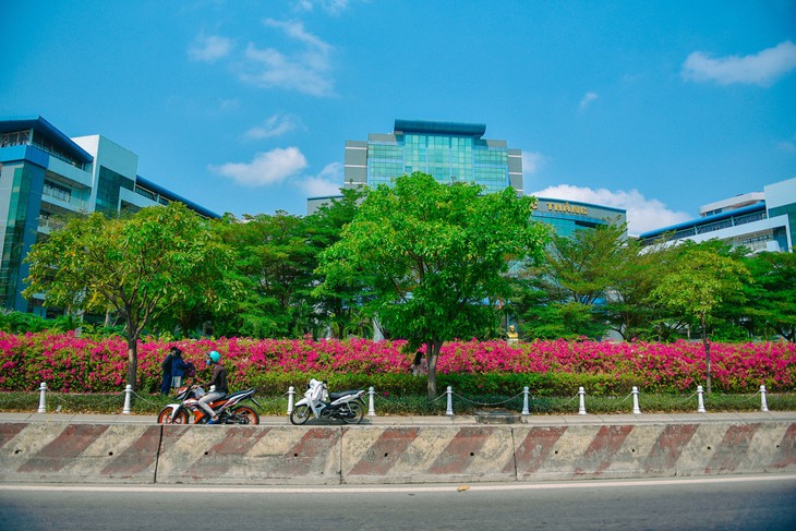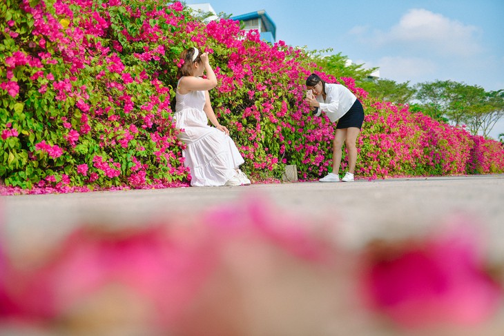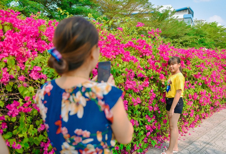 Dọc tuyến Nguyễn Hữu Thọ (quận 7, TP CM) nở rực hoa giấy làm người đi đường không khỏi rời mắt và thu hút nhiều bạn trẻ tìm đến để check-in dịp cuối tuần.
