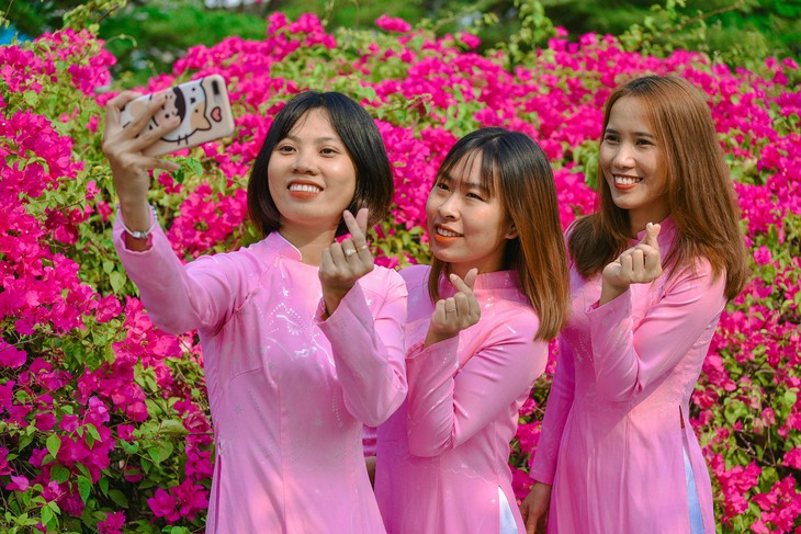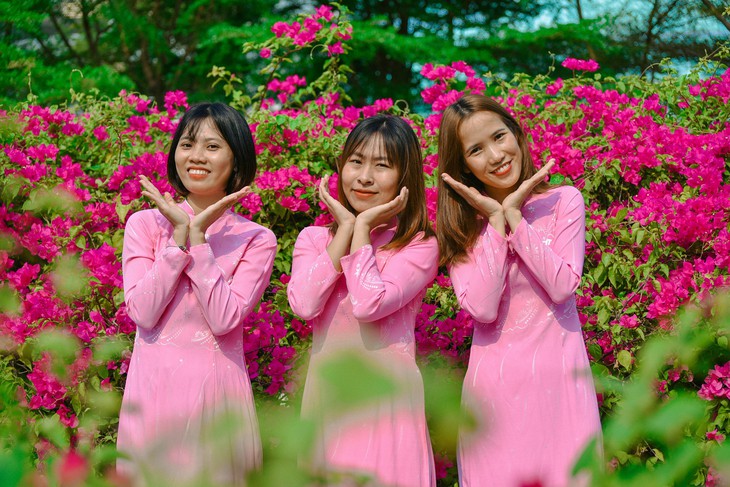 Nhóm bạn Yến Ngọc dù đã ra trường nhưng cũng rủ rê ghé thăm hàng hoa giấy trước cổng trường xưa.Bạn Yến Ngọc (28 tuổi, Q Bình Thạnh) chia sẻ: “Thấy các em khoá sau đăng hình check-in hoa giấy làm mình nôn nao muốn trở lại trường để chụp hình ngay, mình rủ bạn mình về và mặc lại chiếc áo dài truyền thống với mong muốn lưu giữa được chút kỷ niệm thời sinh viên”.