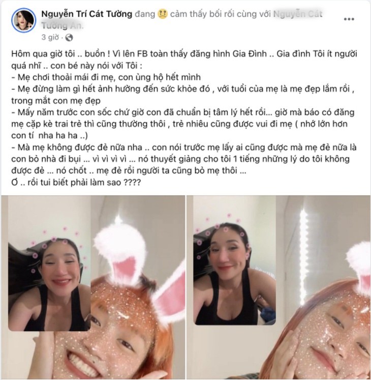 Dù là tâm sự riêng của mẹ con với nhau nhưng Cát Tường không ngần ngại chia sẻ "tất tần tật" với người hâm mộ của mình. Theo đó, con gái Tường An khuyên mẹ cứ thoải mái vui chơi, miễn không ảnh hưởng tới sức khoẻ. Thậm chí, cô bé còn động viên Cát Tường cứ yêu đương, cặp kè trai trẻ nếu vui. Tuy thế, cô bé cũng đưa ra qui định, mẹ có quyền tự do yêu đương trai trẻ nhưng không được nhỏ hơn tuổi mình và không được đẻ.