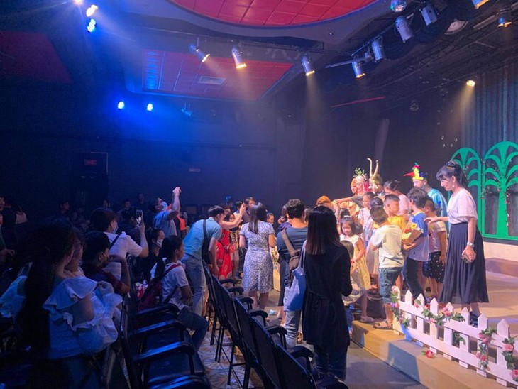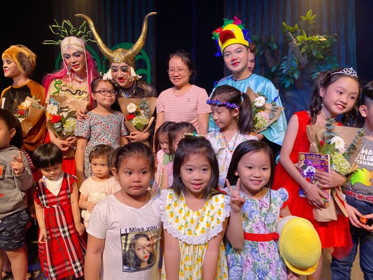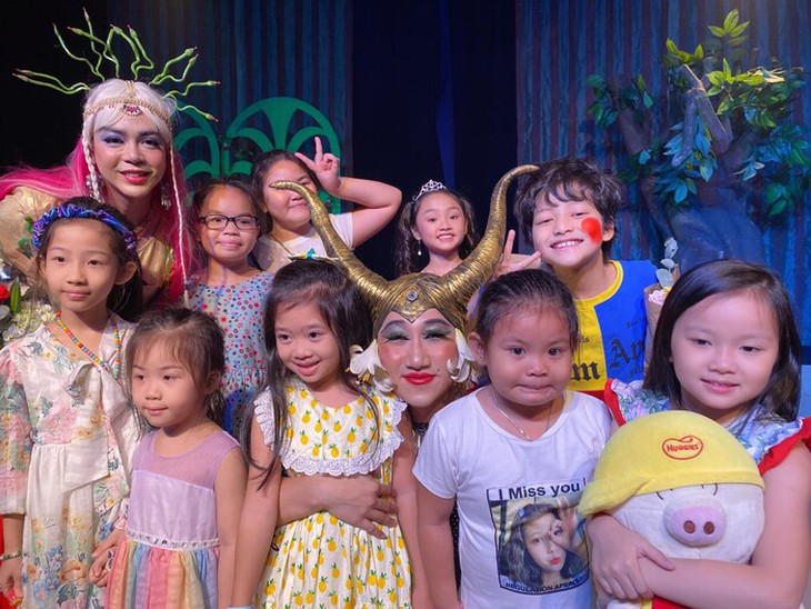 NSƯT Mỹ Uyên chụp hình cùng bé Lavie tại sân khấu kịch 5BNgày 9-11, bảo mẫu của bé Lavie đã đăng tải những hoạt động cuối tuần của hai cô cháu. Cô Họa Mi tiết lộ mình đã đưa Lavie đi xem kịch thiếu nhi.