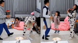 Thấy bố đi làm về chưa kịp thay quần áo đã dang tay ôm mẹ, bé trai nở nụ cười hạnh phúc mãn nguyện.
