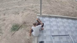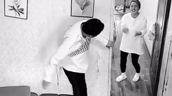 Thấy bố xuất chiêu về phía mình, bé trai lập tức giả vờ dính chưởng, ngã ngửa ra sau.