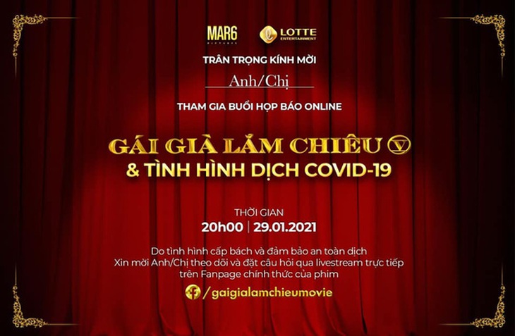 Tiếp nối Bố già, phía ê-kip Gái già lắm chiêu V: Những cuộc đời vương giả cũng quyết định hủy premiere ở khu vực Hà Nội. Riêng ở TP HCM, phim sẽ tổ chức buổi họp báo chung theo hình thức livestream trên fanpage của phim vào 20h tối qua (29-1). Đạo diễn Bảo Nhân cho biết: "Do tình hình cấp bách và đảm bảo an toàn, MAR6 Pictures quyết định tổ chức họp báo hình thức online".