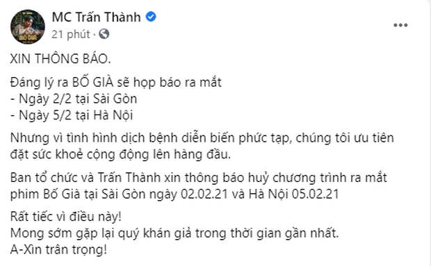 Trấn Thành đại diện ê kíp Bố già thông báo hủy buổii premiereGiữa lúc COVID-19 đang có diễn biến mới, Sở Y tế TPHCM đã đề nghị các đơn vị trực thuộc kích hoạt hệ thống phòng, chống dịch. Bên cạnh đó là tạm ngưng tất cả hoạt động, lễ, hội, tiệc... có tập trung đông người. Điều này đồng nghĩa với việc tất cả sự kiện của làng giải trí đều phải hủy bỏ.