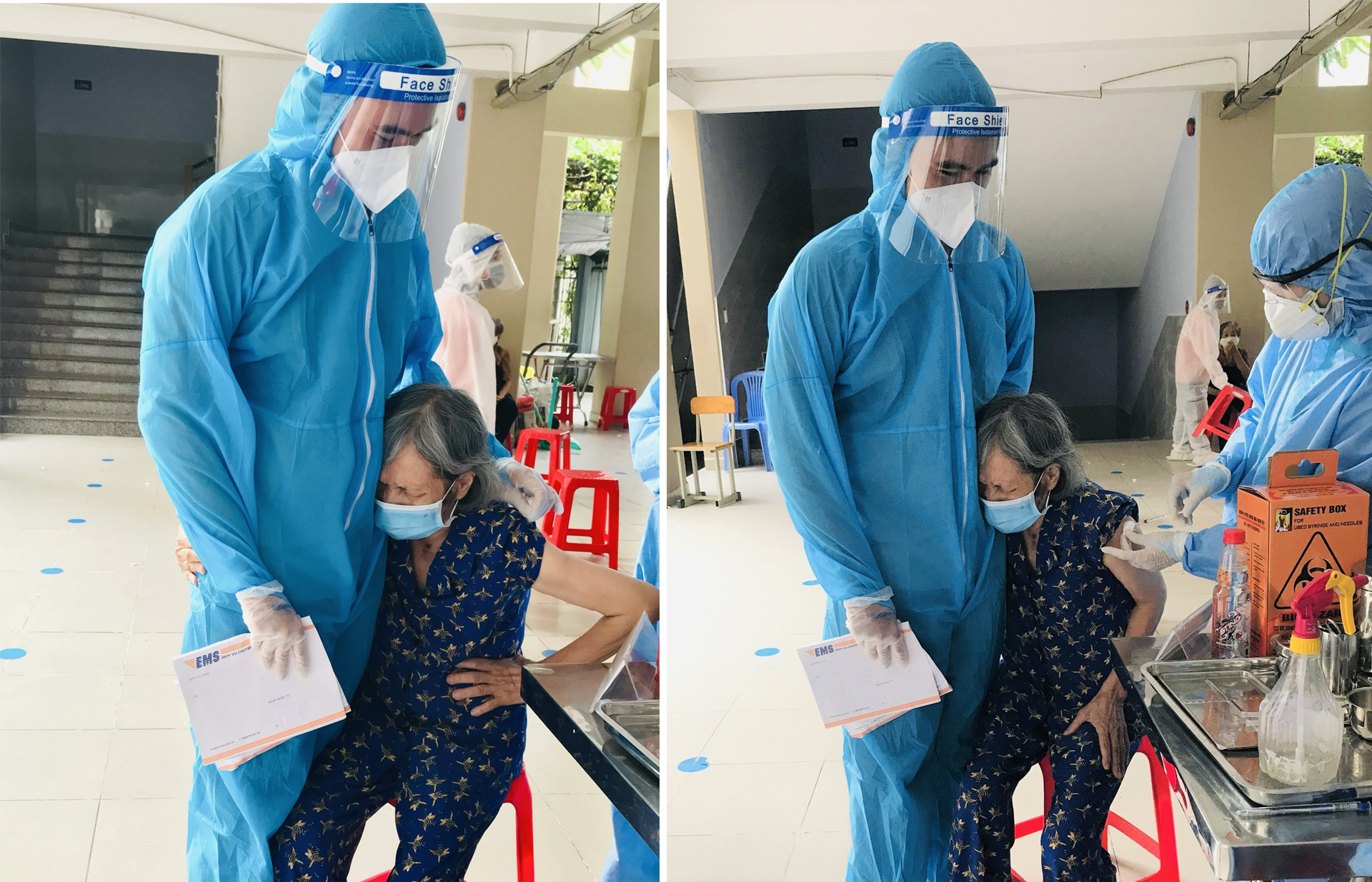 Cụ bà ôm chặt tình nguyện viên ở TP.HCM khi tiêm vaccine để đỡ sợ
