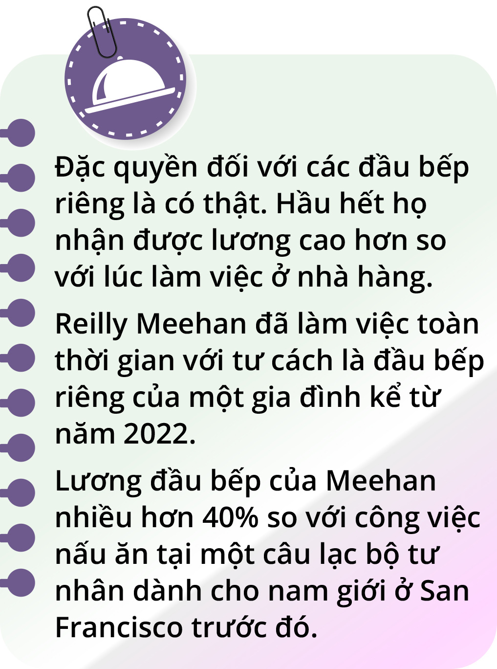 Theo SethLui - ấn phẩm trực tuyến chuyên viết về ẩm thực và đời sống tại Singapore, nghề đầu bếp riêng nằm trong danh sách những công việc nhận lương cao nhất ngành F&B, chưa kể các phúc lợi khác.