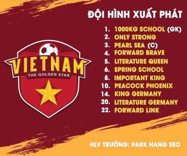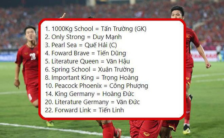 Đội hình xuất phát của đội tuyển Việt Nam trong trận gặp UAE . (Nguồn: Internet)Theo đó, một thanh niên vì quá yêu đội tuyển Việt Nam, và chắc hẳn có "thù" với ngoại ngữ nên đã kết hợp hai yếu tố này thành một, tạo nên "tác phẩm" bá đạo trên. "Chuyển ngữ" hàng loạt cái tên theo cách dịch từng từ vốn sai, nhưng lại là một khía cạnh hài hước của ngôn từ khi được hiểu ở "nghĩa đen nhất có thể".