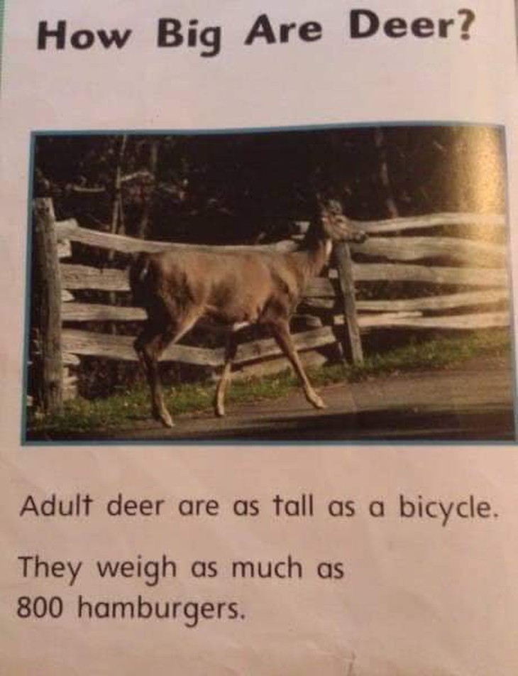 Ở một diễn biến khác, khi được hỏi chiều cao và cân nặng của những chú nai, người Mỹ đã khẳng định chắc nịch rằng: Nai cao bằng một chiếc xe đạp, và nặng bằng… 800 cái bánh Hamburger. Thật là một câu trả lời thú vị và bổ ích!