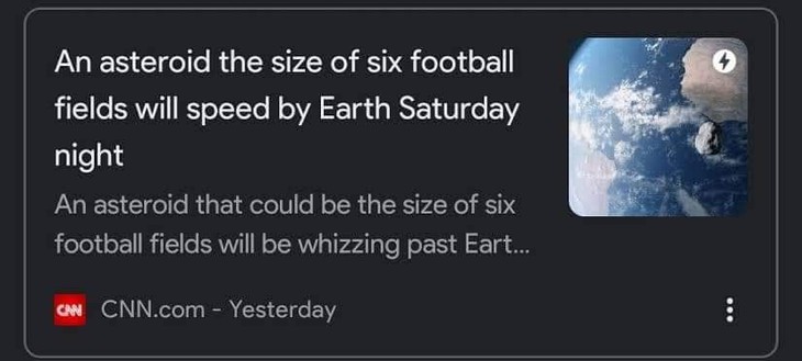 Tạm dừng câu chuyện về khoảng cách xã hội, chúng ta cùng đến với một cách đo lường thú vị khác được đăng tải trên một trong những kênh tin tức lớn nhất đất nước cờ hoa: CNN. Đó là tin một khối thiên thạch to bằng… 6 sân bóng bầu dục đang bay thẳng đến trái đất. Tin tức nghiêm trọng như thế này, nhưng cách các nhà báo đưa tin cũng đủ khiến người khác phải bật cười.