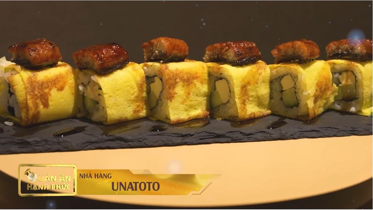 Món “Cuộn Shushi lươn Aburi” là sự kết hợp hoàn hảo từ trứng, phô mai, dưa leo Nhật và lươn. Vị phô mai béo ngậy kết hợp với miếng dưa leo giòn tan, mát lạnh cùng với vị ngọt thơm của thịt lươn sẽ mang tới cho thực khách một trải nghiệm tuyệt vời. Ngoài ra, sự bày trí cùng màu sắc bắt mắt là điểm cộng cho món ăn này.
