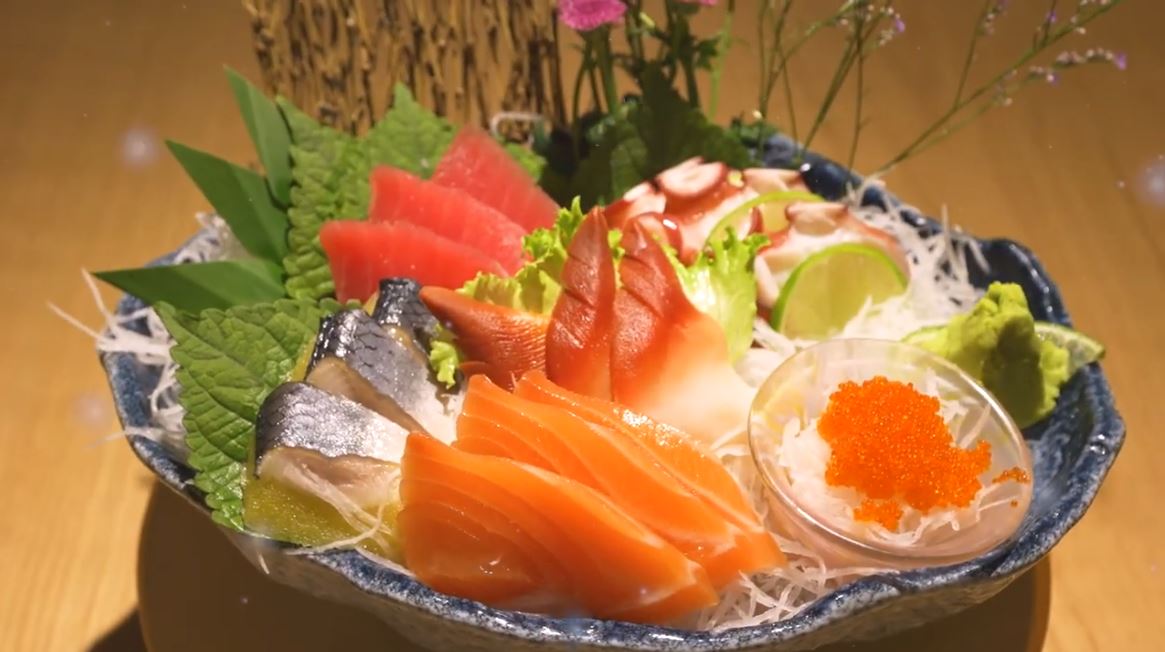 Với món Sashimi tổng hợp gồm có các nguyên liệu: cá ngừ, cá trích, bạch tuộc, sò đỏ kết hợp cùng washabi tươi. Mỗi nguyên liệu chỉ 2-3 lát nhưng được bày trí cực bắt mắt với đá bào cùng hoa lá.
