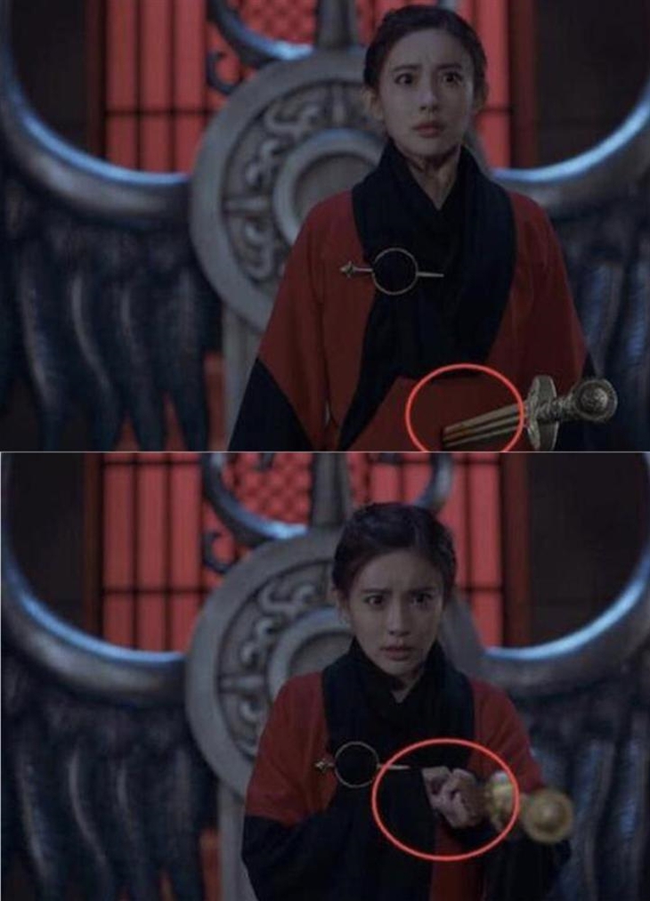 Zoom vào hai thanh kiếm mới té ngửa thì ra Triệu Lệ Dĩnh cũng là người phàm mắt thịt thôi. Chẳng qua là hai thanh kiếm mà Triệu Lệ Dĩnh cầm được làm bằng nhựa, chẳng khác đồ chơi cho con nít lên ba.