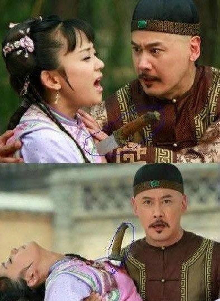 Cảnh Hạ Tử Vy (do nữ diễn viên Hải Lục thủ vai) đỡ dao cho Hoàng A Mã trong Hoàn Châu cách cách cũng khiến người xem phải phì cười bởi ban đầu con dao chỉ được cắm khoảng 1/2 và ở trang phục nữ diễn viên không có vết máu. Tuy nhiên, chỉ vài giây sau đó, khán giả lại tinh ý phát hiện con dao cấm lút cán vào người Hạ Tử Vy khiến máu đầm đìa.